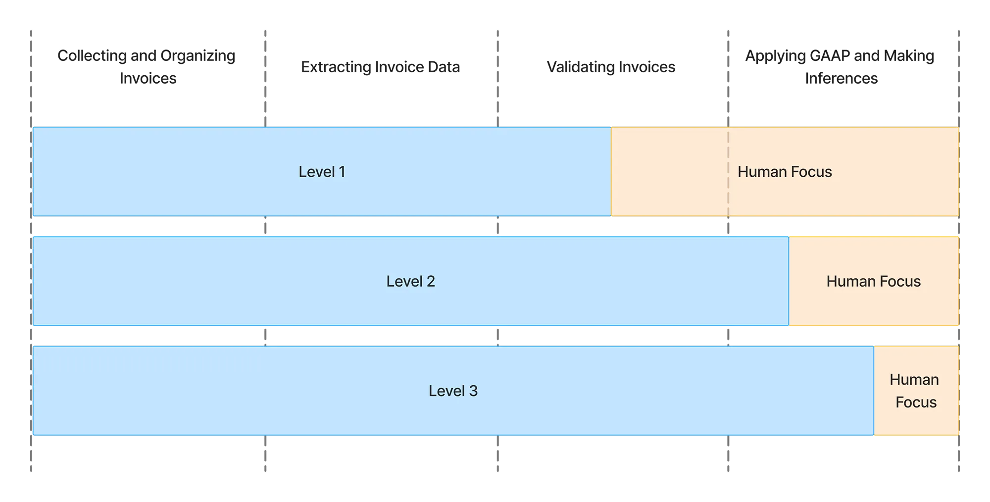 The transition from Level 2 to Level 3 represents the most significant leap in value. In Level 2, although AI could populate invoice entries with high accuracy, human specialists would still need to review every entry before finalization to catch potential errors. In contrast, Level 3 introduces selective human review: the AI agent not only improves in accuracy but also flags invoices that require human attention, allowing low-risk entries to be processed autonomously.