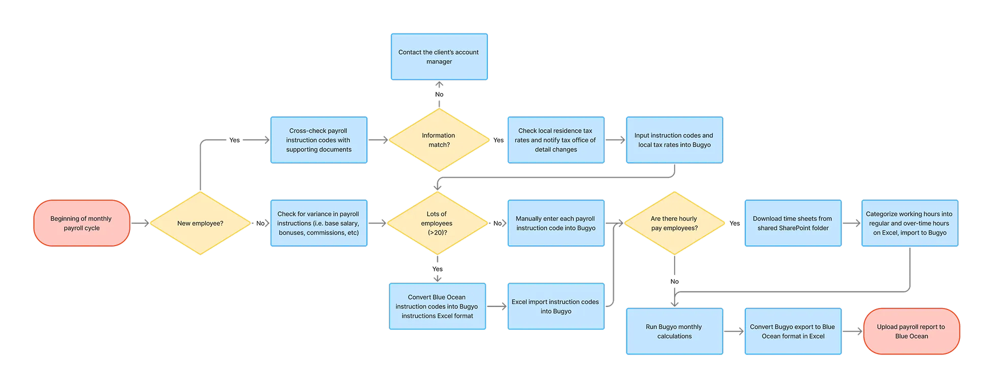 To make sense of the observations, I mapped out workflow diagrams that captured steps, tools, and decisions involved in each stage of the payroll process.