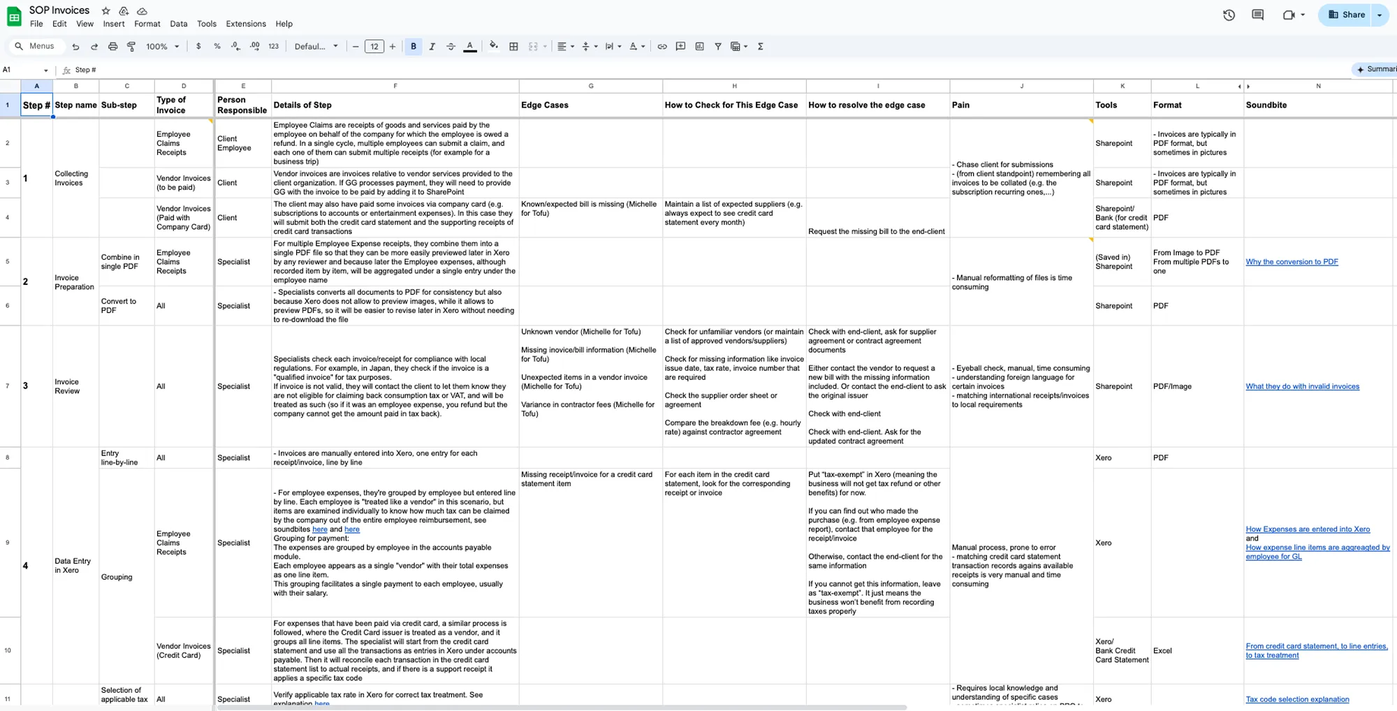 To organize and synthesize our findings, we created spreadsheet that mapped the end-to-end process. This process map included not just the standard flow, but also the common variations and points of failure that accounting specialists routinely encounter.
