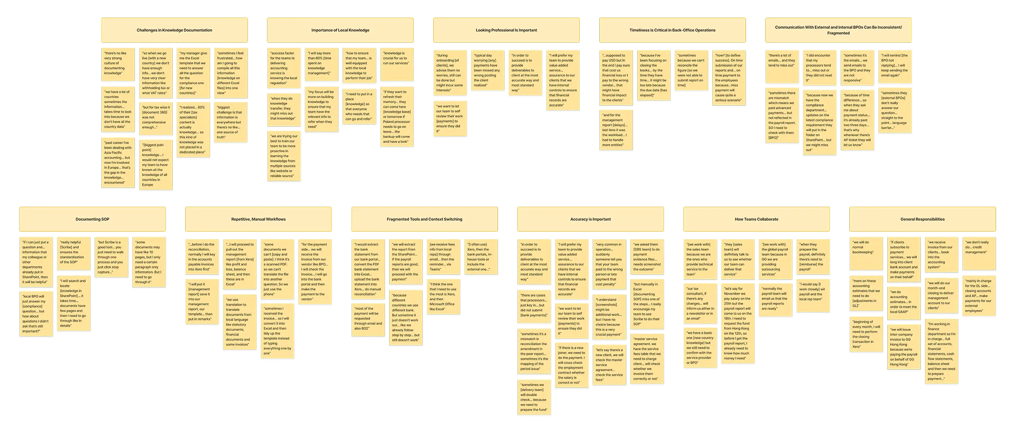 After conducting contextual inquiries with payroll specialists, we shifted our focus to remote user interviews with BPO operators across Malaysia and other GoGlobal locations. Our goal was to broaden our understanding of responsibilities, pain points, and goals across a wider range of back-office roles and varying levels of experience.